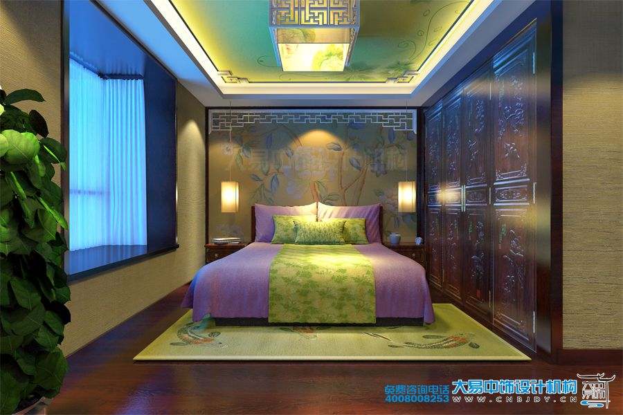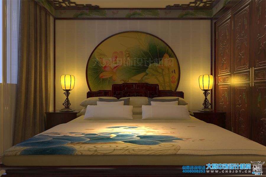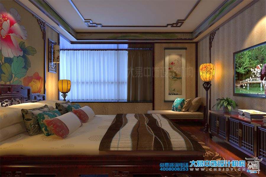 次臥裝修采用了中式風(fēng)格,床頭背景墻上的中國(guó)水墨繪畫更是引人注目,表現(xiàn)出一種非凡的中華國(guó)畫的藝術(shù)感