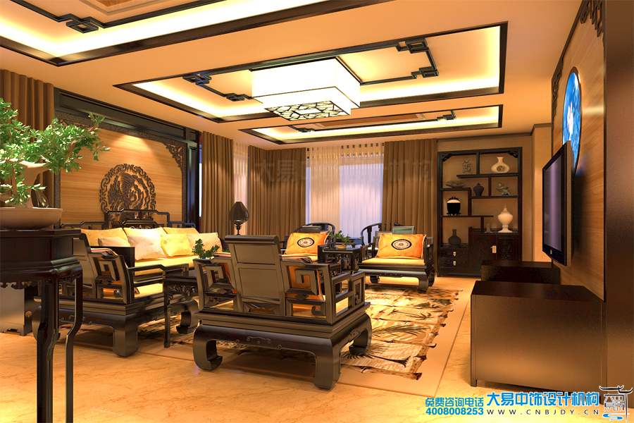 客廳裝飾做工精細,色彩曲美,很有藝術氣息,也很有質感,顯得很有品位,能體現一種古樸厚重大氣之美
