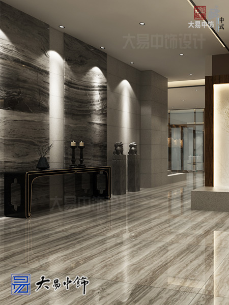 過道頂面以書法心經(jīng)為設計內(nèi)容,給人以靜雅之感,墻面依然以藍灰石材為主題結合金色金屬鑲邊和祥云圖案,打造出了現(xiàn)代優(yōu)雅的品質(zhì)空間。