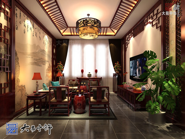 接待客廳中式設計以山水題材的壁畫為沙發背景墻.大氣悠揚。