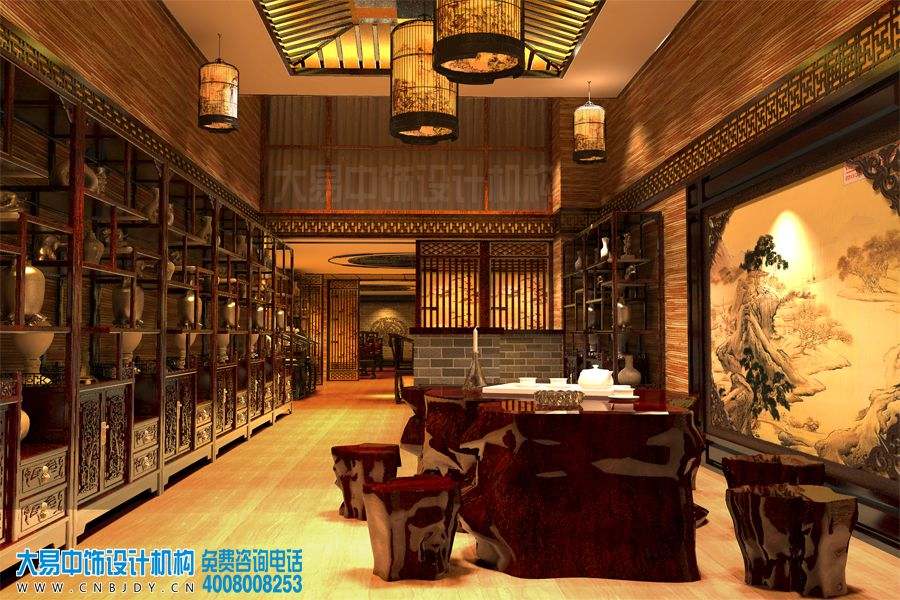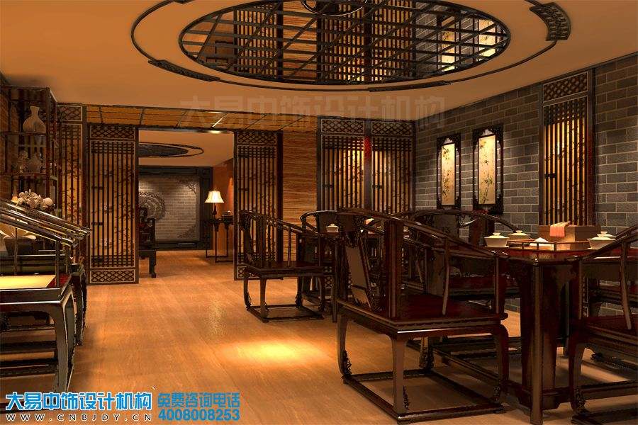 茶樓設(shè)計(jì)大廳裝飾結(jié)合了復(fù)古與現(xiàn)代藝術(shù)裝飾的精華,做工精細(xì)、設(shè)計(jì)獨(dú)特,充分體現(xiàn)了濃郁的中式文化內(nèi)涵