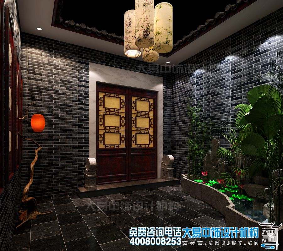 進門之處木門遮掩,古墻花窗、水墨吊頂映入眼簾,綠植飄逸,幽深靜謐,美輪美奐