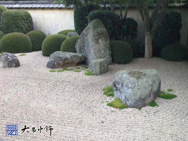 枯山水景觀是日式園林風格裝修設計的一種,最早源于中國,早由中國漢唐時期傳入日本.一般是指由細沙碎石鋪地,再加上一些疊放有致的石組所構成的縮微式園林景觀,偶爾也包含苔蘚、草坪或其他自然元素??萆剿]有水景,其中的“水”通常由砂石表現,而“山”通常用石塊表現。有時也會在沙子的表面畫上紋路來表現水的流動。枯山水字面上的意思為“干枯的景觀”或“干枯的山與水”,既所謂的以沙為水以石為山,體現禪意雅致的效果.大易中飾設計師。通常出現在室町時代、桃山時代以及江戶時代的庭園中。