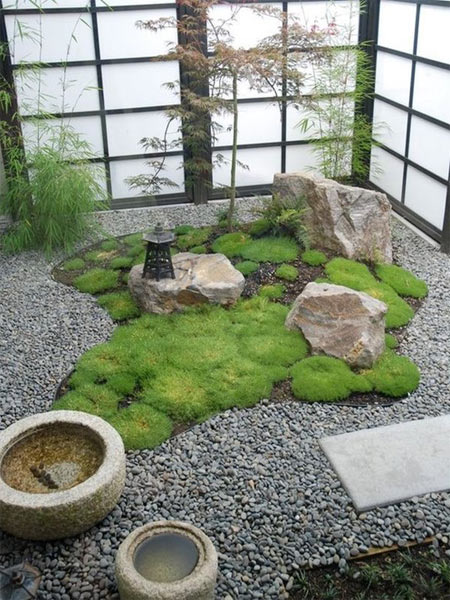 枯山水景觀是日式園林風格裝修設計的一種,最早源于中國,早由中國漢唐時期傳入日本.一般是指由細沙碎石鋪地,再加上一些疊放有致的石組所構成的縮微式園林景觀,偶爾也包含苔蘚、草坪或其他自然元素??萆剿]有水景,其中的“水”通常由砂石表現,而“山”通常用石塊表現。