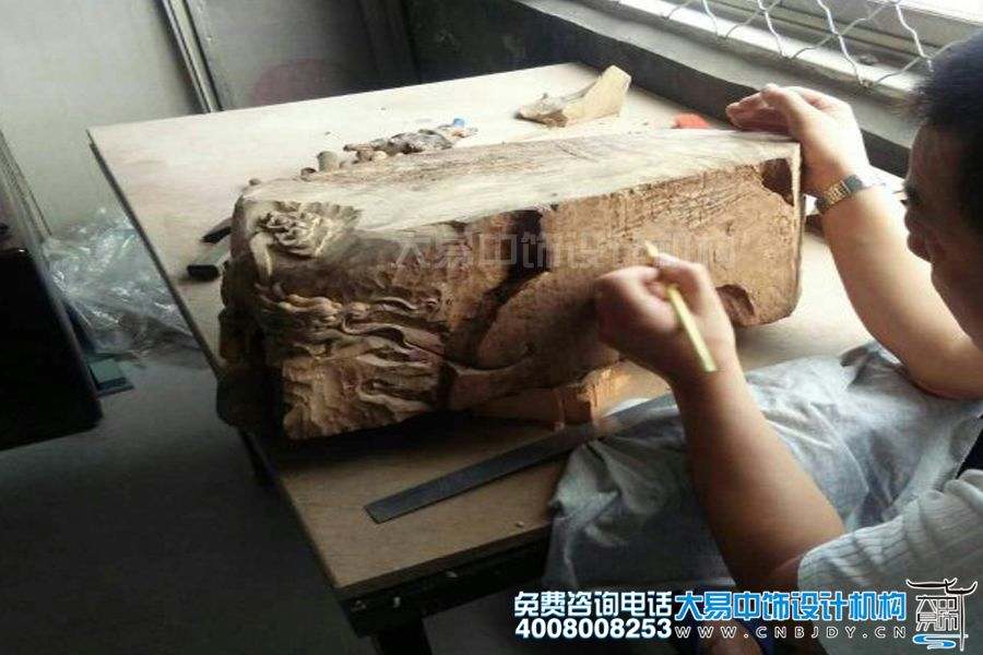 手工雕刻師以精湛的雕刻技藝在元木材上創作出古雅精美的圖案
