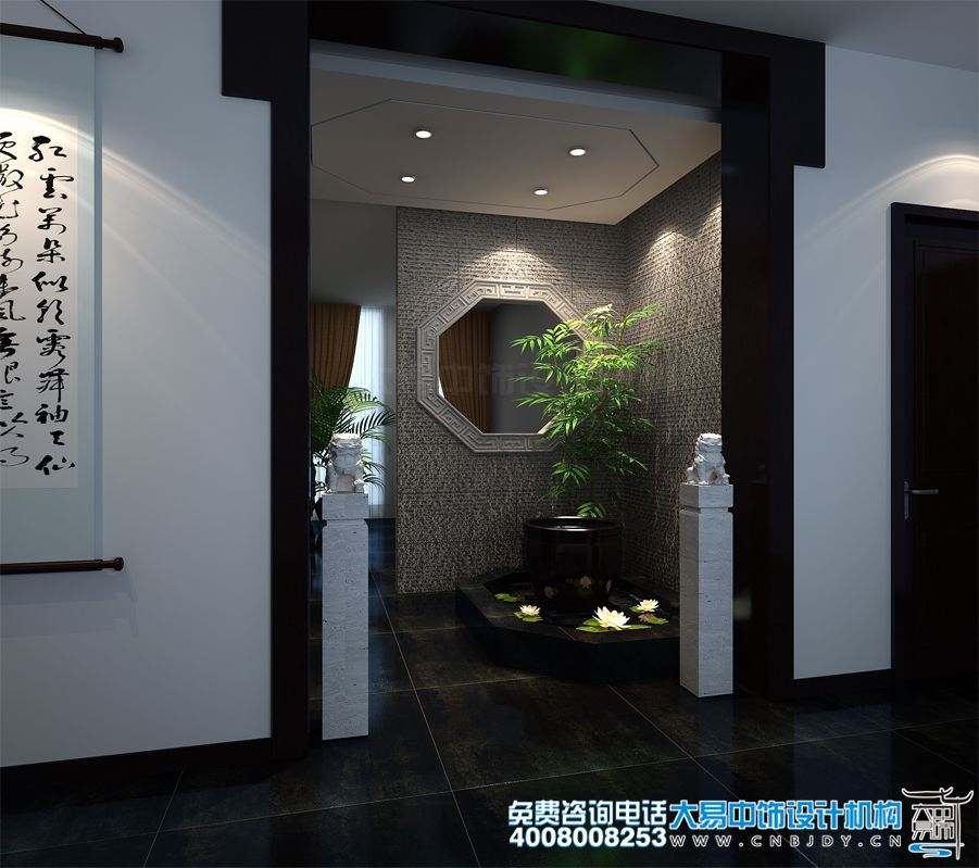 會所中式設計裝修的門廳,一體化設置的白色吊頂與影壁,讓空間設計簡約不少。月洞襯出幾株翠竹,郁郁蔥蔥,清幽靈動。來客休息處擺放中式桌椅,背景墻用水墨丹青為飾。臺下零落擺放盆栽綠植,園林石雕燈散發出淡淡光影。鳥籠燈高懸于頂,將一片明亮灑向四周。