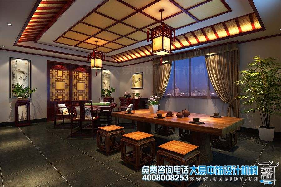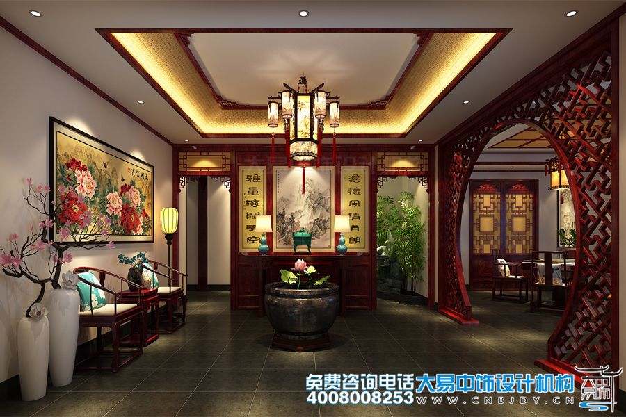 四合院會(huì)所中式設(shè)計(jì),在門(mén)廳處設(shè)計(jì)中堂為屏,條案上的葫蘆型座燈既可作為裝飾,又將畫(huà)幅的內(nèi)容映照出來(lái),一舉兩得。竹節(jié)臺(tái)燈佇立一旁,墻上懸掛著富貴芙蓉圖,有著富貴吉祥的美好寓意。庭中擺一水甕,一株睡蓮靜靜綻放,為整個(gè)空間增添些許禪意和自然氣息。朱紅色的餐廳桌椅,搭配上精致的中式六角宮燈,使整個(gè)餐飲空間硬朗而又華麗、優(yōu)雅。