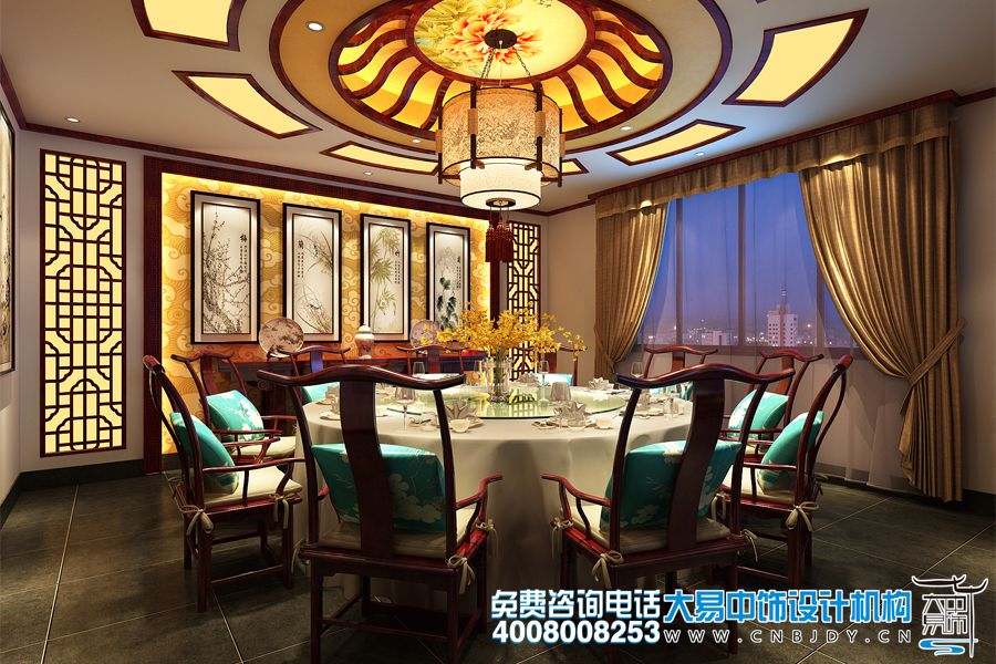 此案例本是餐飲會(huì)所中式設(shè)計(jì)裝修,所以就餐區(qū)的裝飾就更為重要。圖中雅間背景墻懸掛“梅蘭竹菊”四君子畫(huà)幅,彰顯名士清流的高貴品格,淡泊名利的人格品性。又以金色祥云圖案為底色,傳達(dá)中國(guó)傳統(tǒng)符號(hào)的特色韻味,吉祥美滿、和諧共生。圓形吊頂更是以牡丹圖為飾,圓形宮燈流蘇低垂,與圓形餐桌相互輝映,團(tuán)團(tuán)圓圓,和和美美,整體烘托的古風(fēng)雅韻、色感優(yōu)美,展示出中式裝飾的富麗與華美。