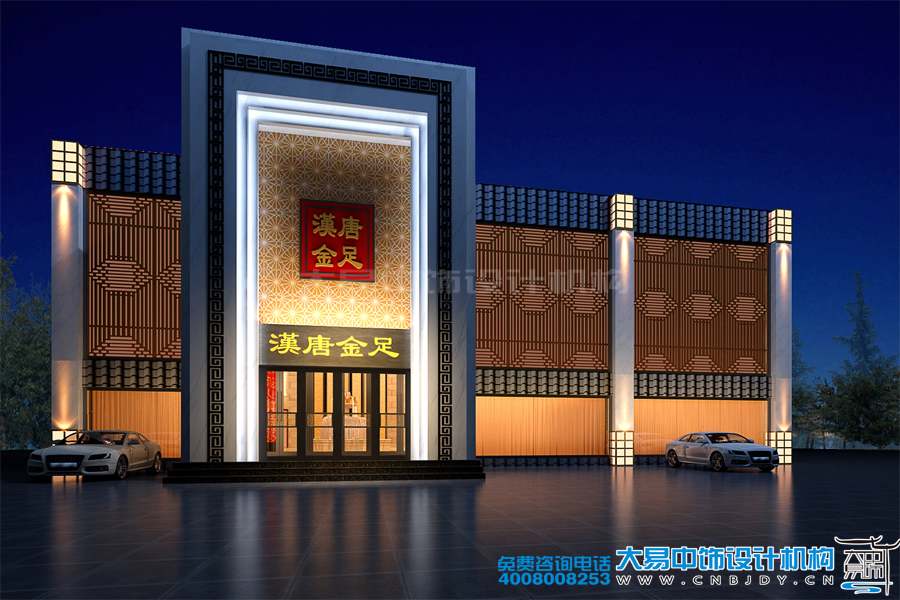 會所中式設計裝修,外景古樸自然,合傳統(tǒng)養(yǎng)生之法。大門兩旁以回形紋邊飾,有源遠流長、生生不息的寓意。漢唐金足四個大字以經(jīng)典的中國紅與黃色搭配,極具古典范。墻飾又以木欄與燈光相互輝映,古樸之外又不乏高端品味,更顯專業(yè)態(tài)度和文化底蘊。