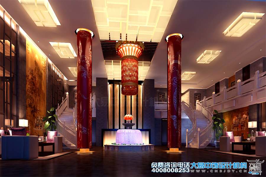 會所大堂正中供奉一尊蓮花燈,金屬托盤,水晶底座,悠悠然釋放光芒,禪意靈動,彌漫四周。兩尊雕龍頂梁柱立于正堂,吊燈也以紅色為主,底部又為蓮花形狀,整體設計相得益彰。墻面以傳統(tǒng)畫作為飾,更有玉石欄桿陪襯,空間典雅清新,明亮動人。