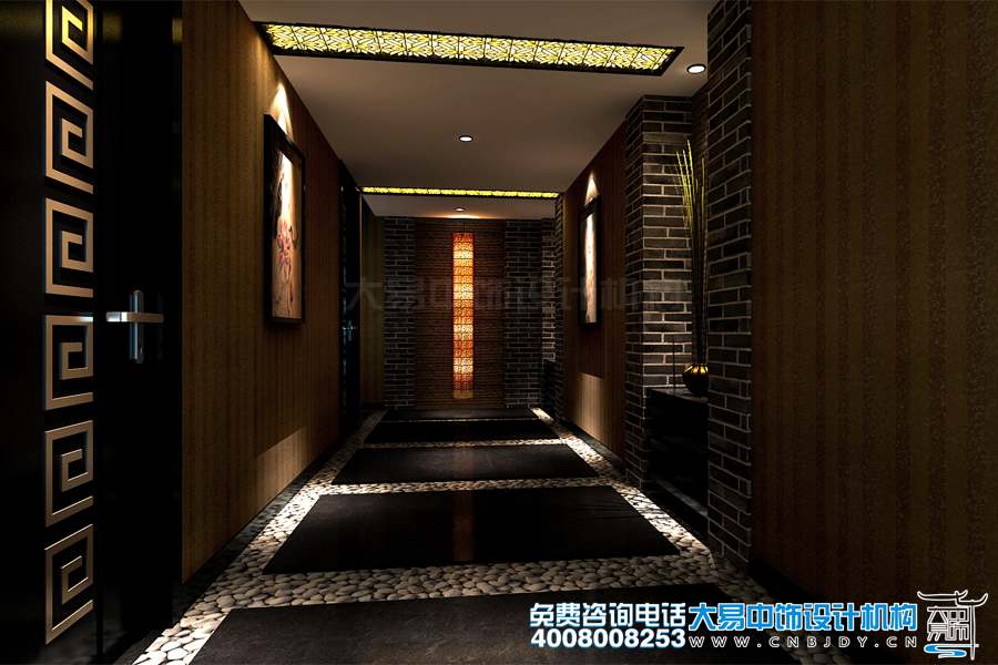 會所中式設計裝修,過道之處以大理石鋪就,兼有鵝卵石點綴,與足道理念契合。門飾依然有回形紋,灰色磚墻與原木色墻面配合古樸自然,悠然的燈光讓空間更具神秘色彩,靜、凈、境,無限意蘊在細節(jié)之中展現(xiàn)無遺。