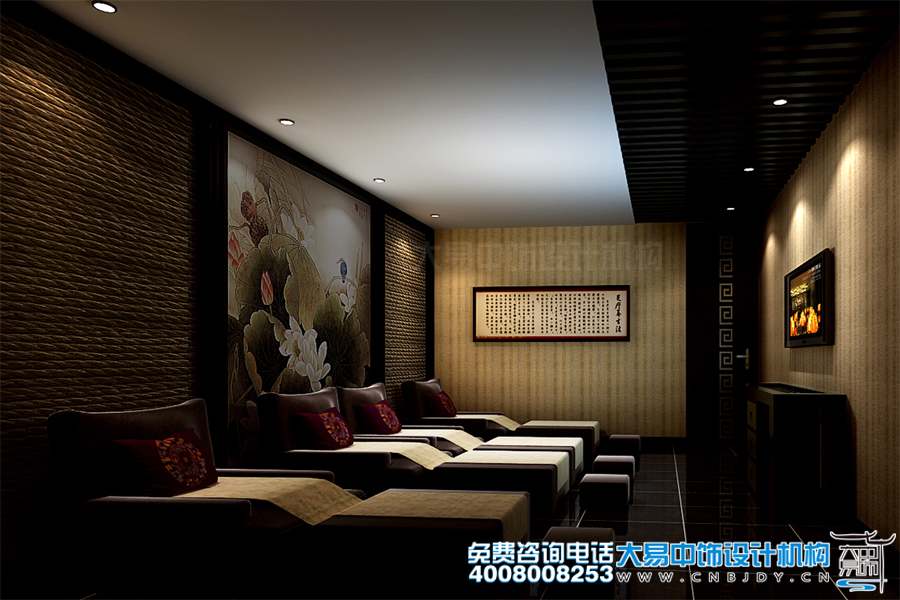 足道會所中式設計裝修,足浴包廂背景墻掛巨幅蓮花畫作,墻面多以原木色、米色等為主,側(cè)墻又懸掛書法作品,稍作點綴。燈光不宜過亮,氳影幽然,溫馨朦朧??繅|上的刺繡也是極為傳統(tǒng)的元素,稍顯艷麗的顏色與整體色調(diào)相中和,恰到好處。