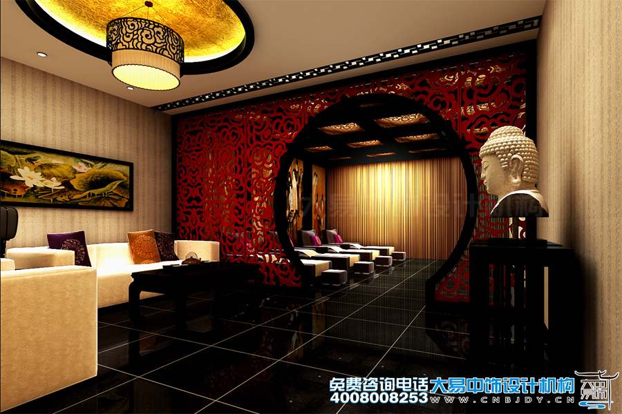 足道文化在我國歷史久遠,針對人體穴位的專業(yè)功法、泡足藥浴,從而達到養(yǎng)生保健的一種傳統(tǒng)中醫(yī)手法。既是傳統(tǒng)文化,足道場所的陳設就要起到烘托映襯的效果。此為大易中飾設計推出的漢唐金足休閑會所中式設計裝修案例,從足道會所外景至內(nèi)部陳設,一應為古典中式風格,“蓮”這一典雅元素的運用在此案例中十分豐盈,充斥在各個細節(jié)和環(huán)境中。因此漢唐金足不僅幽雅靜謐,還給人以禪意安然,與中醫(yī)養(yǎng)生之道也十分契合。讓來者在如此宜人的環(huán)境中得到全身心的放松和釋然。
