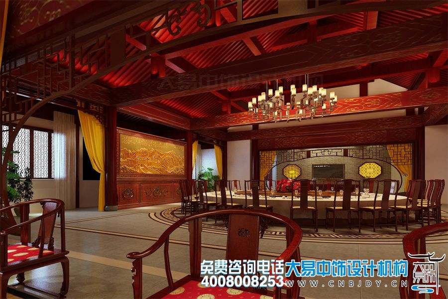 大易中飾在此餐飲會所中式設計裝修中引用中國傳統主色調紅黃二色,襯托出一派宮廷王室的御宴景象,在現代社會能顯出如此氣派,非中式設計所不能有!
