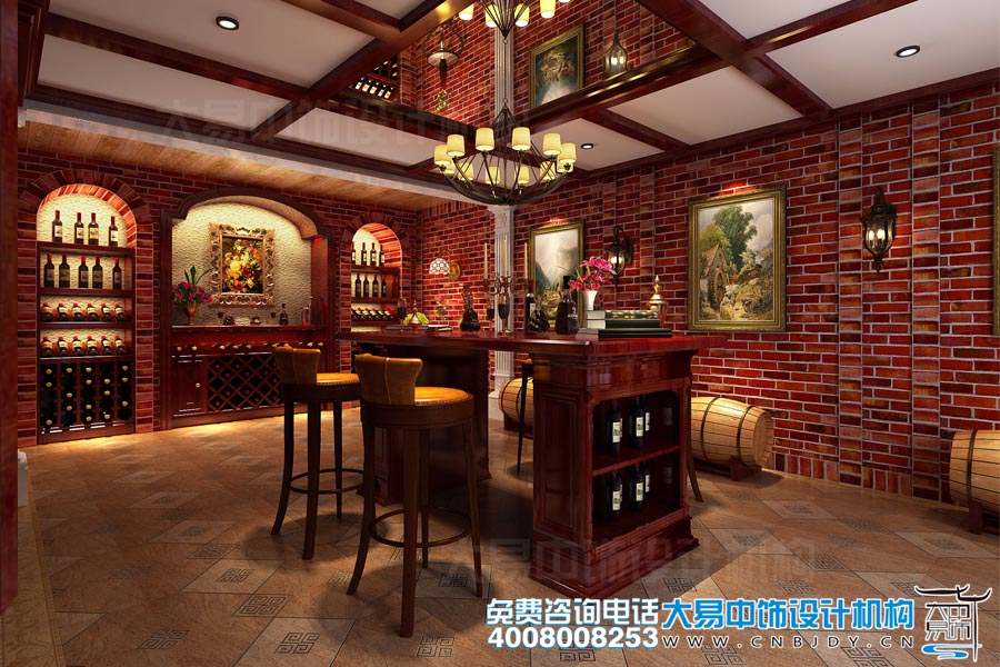 業主夫婦喜好收藏紅酒,因此大易中飾設計師在別墅中式設計裝修中特意留一處做紅酒窖。因要隔絕光照,四面皆用紅色磚墻圖,吊頂亦是半密封狀態,留一些空間以保證酒窖的通風和溫度。