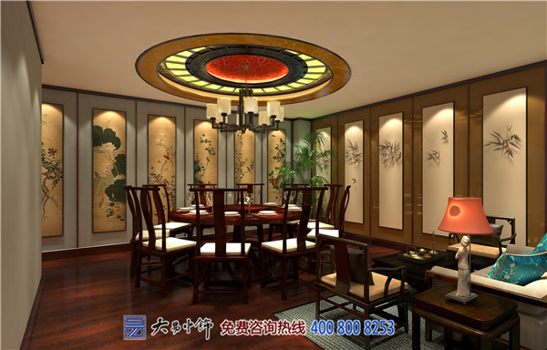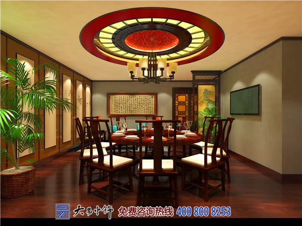 中式餐廳裝修設計首先要有中式元素,凸顯中式風格。本案例中,大易中飾針對不同的包房設計不同的裝修特點。