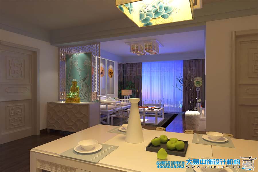 現代住宅中式設計裝修,在餐廳望向客廳,可以看到玄關處供奉的佛像,軟格將兩個功能性空間隔開。客廳里簡約設計的白色坐具,小型茶幾,落地窗戶可以俯瞰到整個城市的景致,素雅的白,高潔的白,將整個居室映照出非典型的古典美韻,襯托出生活中無限的和諧與美感。