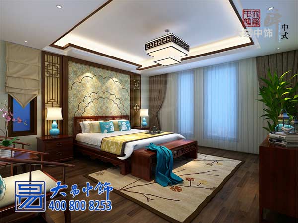 木紋地板盡顯古樸,輕腳慢步無絲毫聲響。床具背景墻用木欄勾畫花邊底紋的中式墻紙,折疊式窗幔低垂下來,將一抹夜色輕輕引進室內(nèi)。