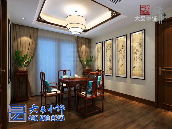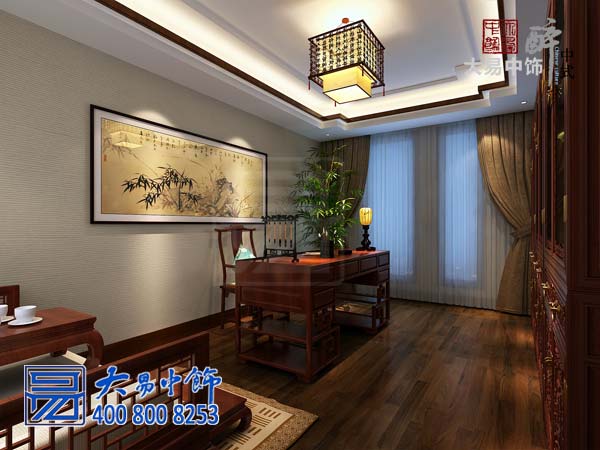 書房的設(shè)計頗具文人的清雅高潔之氣。雕花書桌,文房四寶俱全,背景墻以竹韻詩畫裝裱作品。墻角幾株翠竹,吊燈用鏤空字紋木框,四角飛揚的流蘇,在上空散發(fā)出書香氣息。