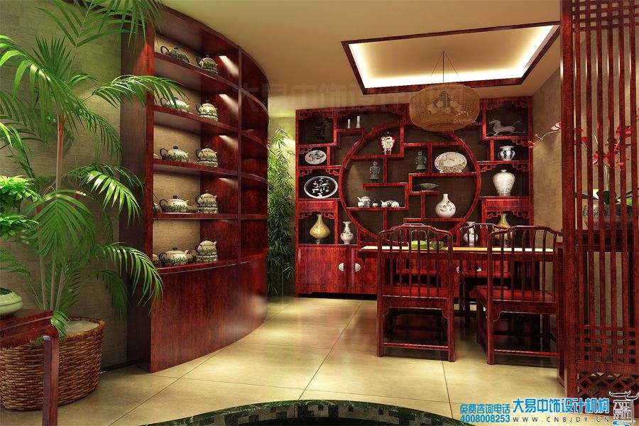 案例賞析:這是一套新中式茶樓裝修效果圖,它位于山東泰安市區。,因茶館裝飾設計定位于新中式,所以,大易中飾設計師利用中式文化深厚的意蘊和時尚創意的現代藝術基調,整體打造出帶來禪韻和寧靜的感覺。讓茶館雅然之意,從氛圍營造上表達得淋漓盡致。當然,設計師還結合現代人的審美觀點,以淺色在茶館中始終與暖意的裝飾、深沉的實木家具協調點綴,加之腳下灰色的仿古地磚的鋪設,窗格花掉、自然綠意的修飾,不但有種復古的裝飾氛圍,還吸取茶道意境的精粹,為進入茶館的飲茶者們營造出清新悠然的休閑效果。