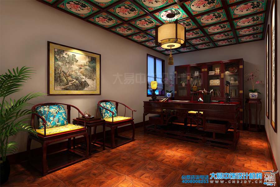 二樓書房選擇雅致的中式風格,與精致端莊的紅木家具形成滿室書香,雅氣飄逸