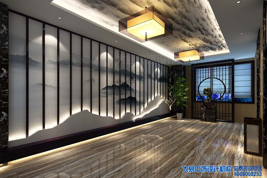 案例賞析:現(xiàn)代新中式風(fēng)格并非完全意義上的照搬復(fù)古成分,而是經(jīng)過一些藝術(shù)表現(xiàn)手法,將傳統(tǒng)文化的端莊、大氣之韻與時(shí)尚、靈動(dòng)的現(xiàn)代審美需求緊密的聯(lián)系在一起,加上大易中飾設(shè)計(jì)師嫻熟的文化素養(yǎng),以及對(duì)色調(diào)掌握的妥當(dāng)拿捏,都在現(xiàn)代辦公場(chǎng)合演繹的淋漓盡致。尤其是辦公場(chǎng)合中大面積的國(guó)畫背景墻、木雕隔斷、圓形古燈,以及具有中式元素的中式飾品的使用,都是整個(gè)空間不可缺失的元素,它們和諧共處,表現(xiàn)出大氣、端莊的格調(diào),同時(shí)也為員工工作塑造出輕松、舒適的環(huán)境。