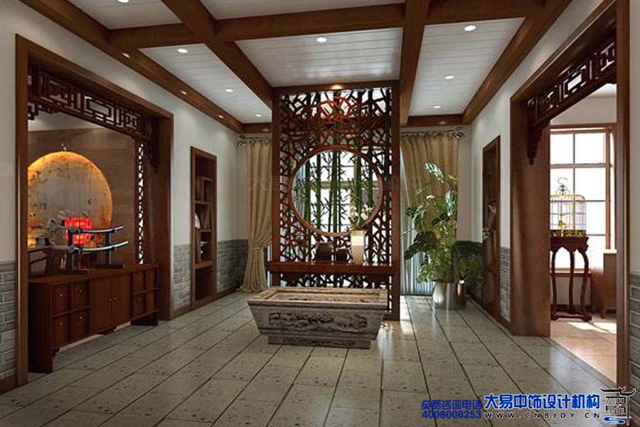 進(jìn)門玄關(guān)氛圍古色古香,鏤空的實(shí)木隔斷,更彰顯了業(yè)主高端的生活品味