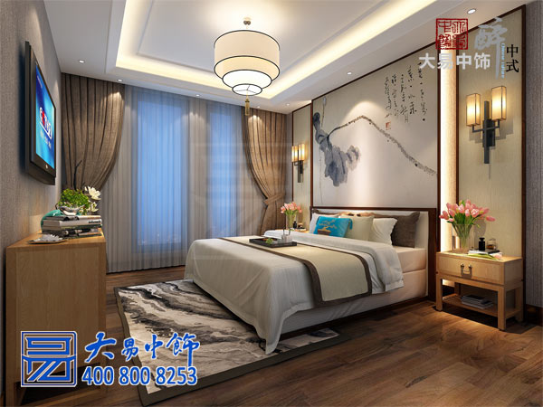 臥室設計頗有空靈的禪意。以素白和原木為主要色調,床具背景的水墨畫以留白的寫意增添了空間的藝術美感。兩旁的壁燈更是別致幽然。