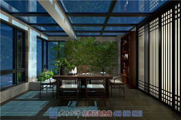 因為業主希望有一個娛樂放松的空間,設計師對陽光房的布局更加用心。陽光房內置茶桌椅,休息的同時我們還希望業主可以放松身心,因此陽光房對面設綠植裝飾,左側方設小型花壇,業主可以養養花種些草。